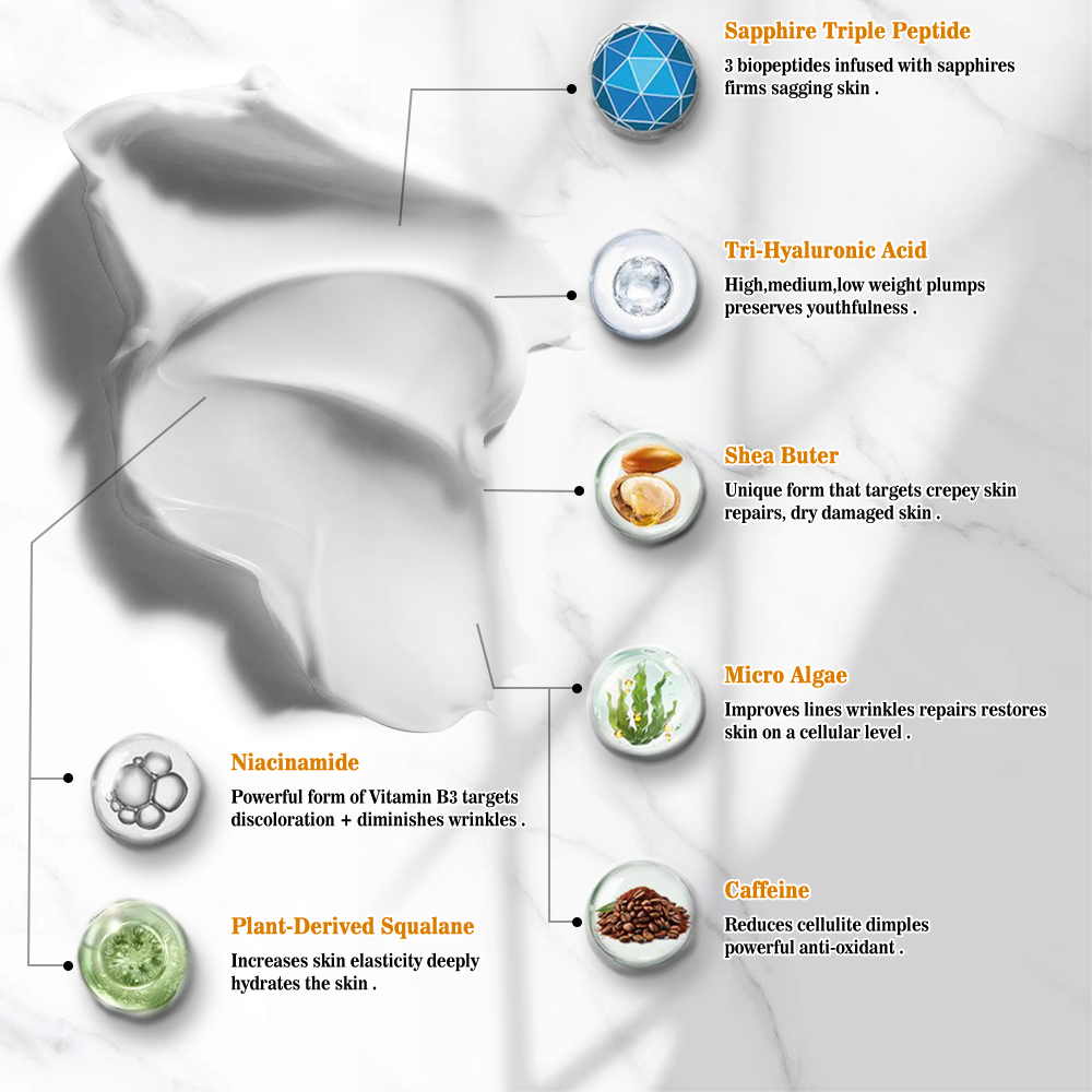 - Sapphire-Infused Triple Peptide: Celebrated as the pinnacle of peptide technology, this complex penetrates the skin layers more deeply for accelerated results, effectively addressing the concerns of crepey and lax skin.